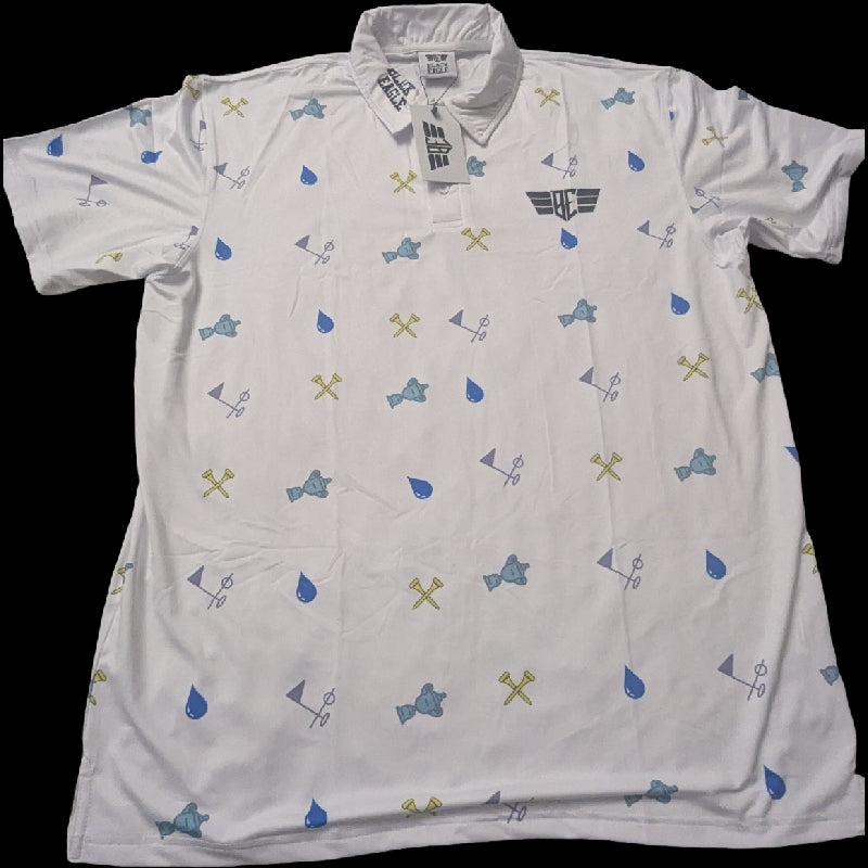 Trophies and Drip Polo has Sublimated Logo with trophies/drip print shirt made of 88% Polyester and 12% Spandex.